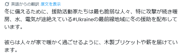 冬に向かう人々の準備を援助するために、支援従事者は、攻撃により、暖房、飲料水、電力が寸断し続けている、特にウクライナの最前線の地域で、もっとも脆弱な人々に冬の援助を配布している