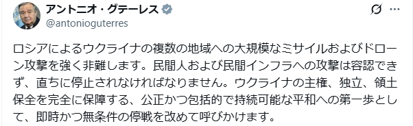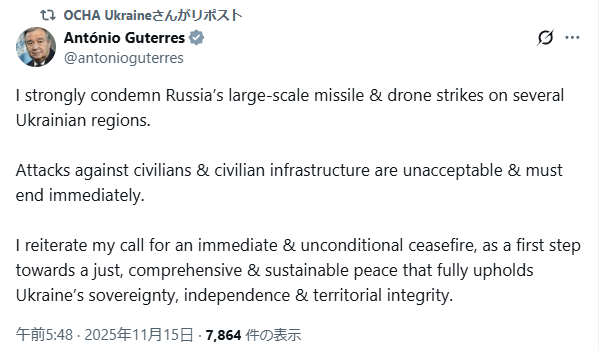2025年11月15日にOCHAウクライナがリポストした、アントニオ・グテーレスさんのポストです