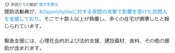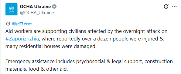 援助従事者は、夜通しのザポリージャへの攻撃によって、影響を受けた市民をサポートしている