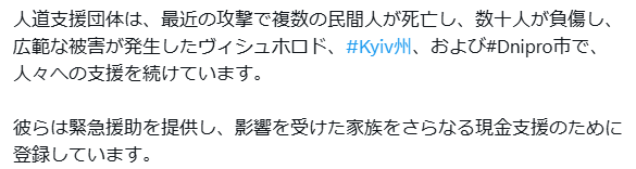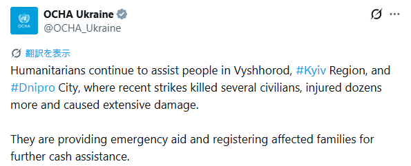人道支援者たちは、最近の攻撃が市民が殺され、負傷し、激しい被害が起こっている、ドニプロ州やキーウ州のビシュホロドで、援助を継続している