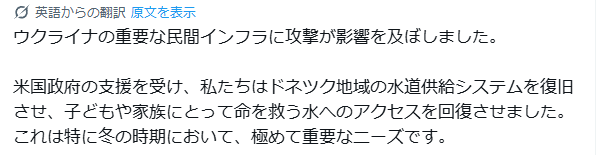 アメリカ政府からの援助によって、私たちは、特に冬季に需要が高まる、子供たちや家族のための水へ、全土へのライフセービングを回復するために、ドネツク州の水供給システムを回復させた
