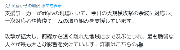援助支援者は、キーウにいて、今日の大規模な攻撃の後の状態に、対応して、一次対応者や勝利チームの努力をサポートしている