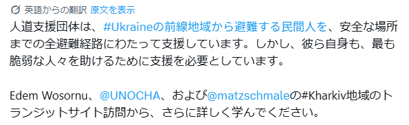 人道支援者は、安全な場所まで、完全な避難行程に、民間人を、ウクライナの最前線のエリアから、避難することを、援助している