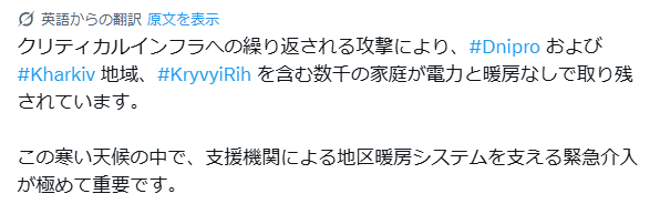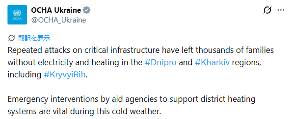 重要施設への繰り返される攻撃は、ドニプロや、ハルキウ、クリーリヒウを含む地域では、電力や暖房がない状態に、数千の家族を追いやった