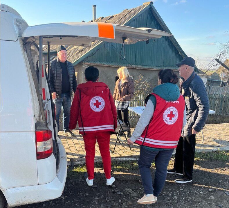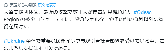 人道支援者は、攻撃が停電状態にしている、影響を受けたオデーザ州の数千人のコミュニティへ、緊急避難用品やその他食料以外の用品を、配布した